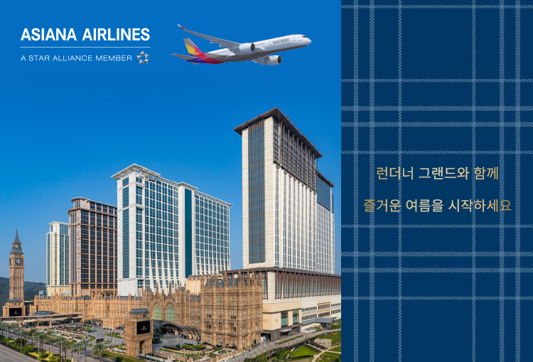 아시아나 승객과 회원은 신규 호텔인 Londoner Grand에서 기간 한정 전용 혜택을 누리실 수 있습니다. 이 패키지에는 2인 투숙과 투숙당 스파 크레딧 MOP 400가 포함되어 있습니다*.